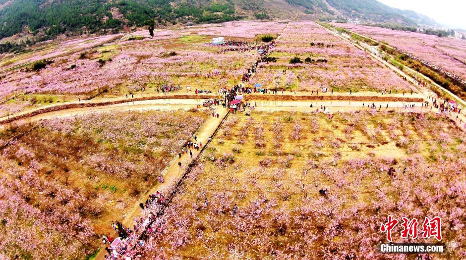 鸟瞰浙江仙居桃花成片开放甚为壮观