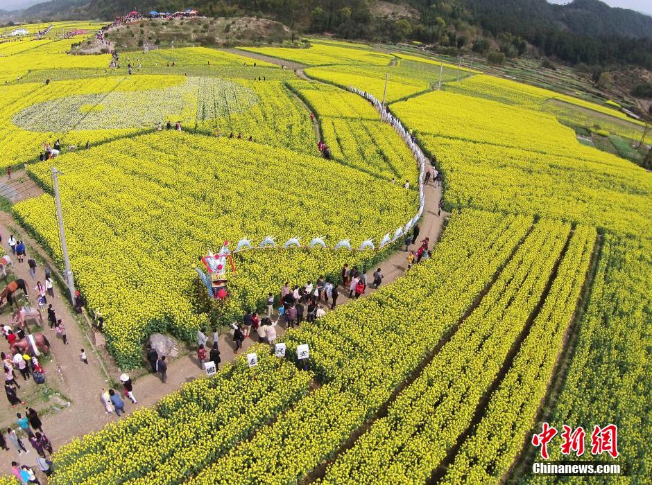 3月20日,浙江省仙居县下各镇厦阁村油菜花田盛开,村民用纸木扎起了长达百米的长“龙”,穿梭在金黄的花海中甚是醒目。 中新社发 王华斌(通讯员) 摄
