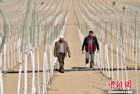 图为两名叶城县民众在检查滴灌带是否正常供水。 孙亭文 摄