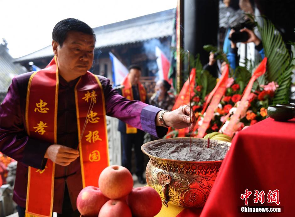 3月23日,重庆举办纪念民族英雄岳飞诞辰913周年暨重庆市关岳庙首届岳飞春祭大典,来自中国大陆23个省市和台湾、加拿大、韩国、日本等国家和地区的岳飞后裔代表、岳氏宗亲近500人在淅沥春雨中祭祀祈福。祭祀现场,岳氏后裔们身披写有“精忠报国”字样的绶带,高歌岳飞创作的《满江红》,通过默哀、敬香、诵读祭文等形式表达对民族英雄岳飞的缅怀与纪念。图为重庆市岳飞文化交流协会会长、岳飞28代孙岳朝军在祭祀大典上敬香。 周毅 摄