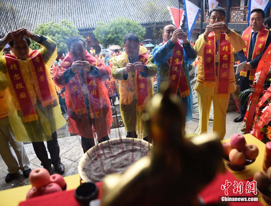3月23日,重庆举办纪念民族英雄岳飞诞辰913周年暨重庆市关岳庙首届岳飞春祭大典,来自中国大陆23个省市和台湾、加拿大、韩国、日本等国家和地区的岳飞后裔代表、岳氏宗亲近500人在淅沥春雨中祭祀祈福。祭祀现场,岳氏后裔们身披写有“精忠报国”字样的绶带,高歌岳飞创作的《满江红》,通过默哀、敬香、诵读祭文等形式表达对民族英雄岳飞的缅怀与纪念。图为岳氏宗亲在祭祀大典上敬香。 周毅 摄
