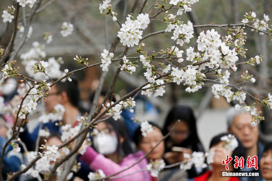 3月22日,北京玉渊潭公园早樱盛开,吸引市民前来赏花踏春。公园樱花基地自行繁殖而成的“苔清水”、“越之彼岸”等新品樱花首次亮相。新品种的增加使得目前园内可供观赏的樱花品种突破30种,总数达到2300余株。中新社记者 杜洋 摄