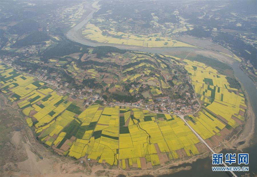 这是使用航拍器拍摄的绵阳市梓潼县玛瑙镇的油菜花田(3月22日摄)。三月,四川大地的油菜花进入盛开期,不少乡村从“种田地”向“卖风景”转变,通过创意耕种,在田间“绘”出美丽风光图。 新华社记者江宏景摄
