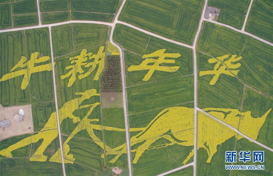 这是使用航拍器拍摄的成都市天府新区籍田街道粮丰村的油菜花田(3月22日摄)。三月,四川大地的油菜花进入盛开期,不少乡村从“种田地”向“卖风景”转变,通过创意耕种,在田间“绘”出美丽风光图。 新华社记者江宏景摄