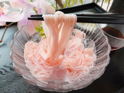 樱花素面其做法是将紫苏粉、樱花粉一起和面,做成粉嫩剔透的素面,还透出淡淡的红晕,看起来晶莹透亮。入口后更是清新,芳香中又透着些许清凉。