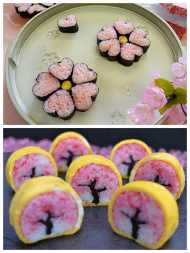 樱花寿司该寿司通常只在樱花盛开的时节供应,粉色的寿司和美丽的花朵相映成趣,堪称秀色可餐。这类寿司主要包括樱卷、烧樱鱼立寿司和樱金枪鱼寿司等。