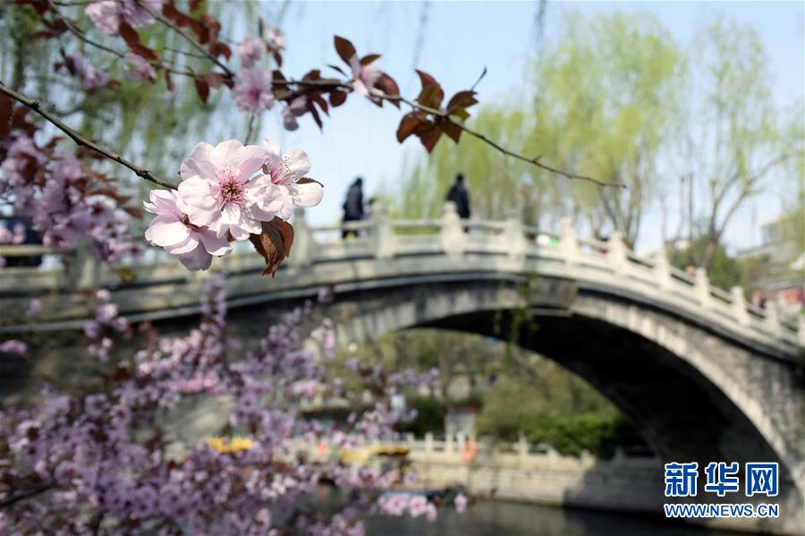 3月23日,繁花掩映着济南琵琶桥。近日,山东济南持续升温,济南护城河两岸柳树吐新,春意盎然。 新华社记者 朱峥 摄