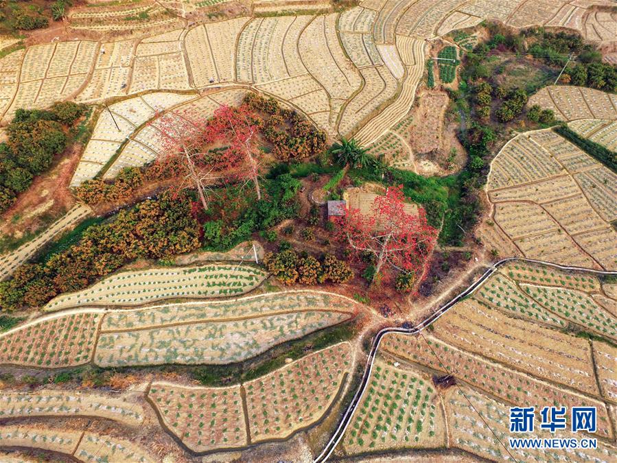 3月22日拍摄的广西百色市右江区永乐镇田园景色。时下,正值广西百色市右江区永乐镇西瓜春种护理和芒果花开叶绿的季节,地膜纵横交错的层层瓜田和绿意盎然的芒果园连成一片,与壮族村寨构成一幅幅美丽的田园画卷。新华社发(韦万忠 摄)