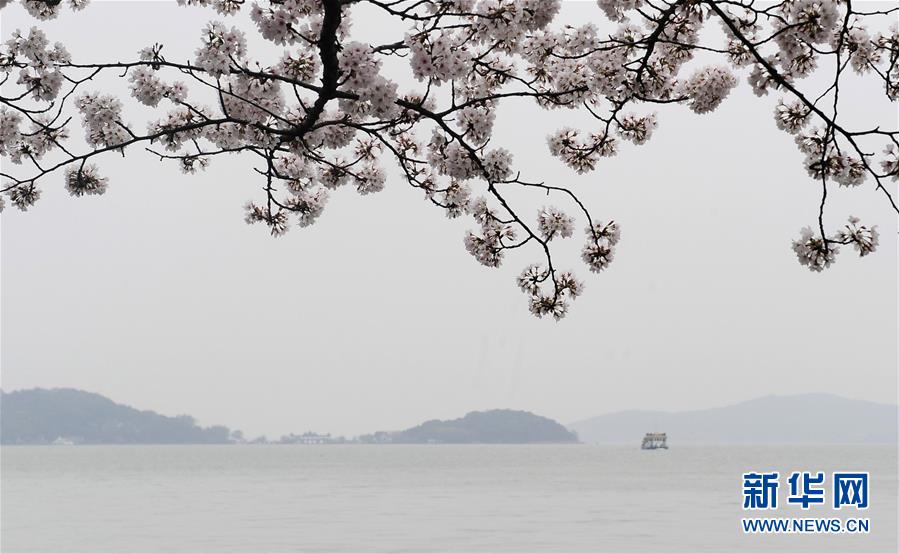 这是3月22日拍摄的无锡太湖鼋头渚风景区盛开的樱花。