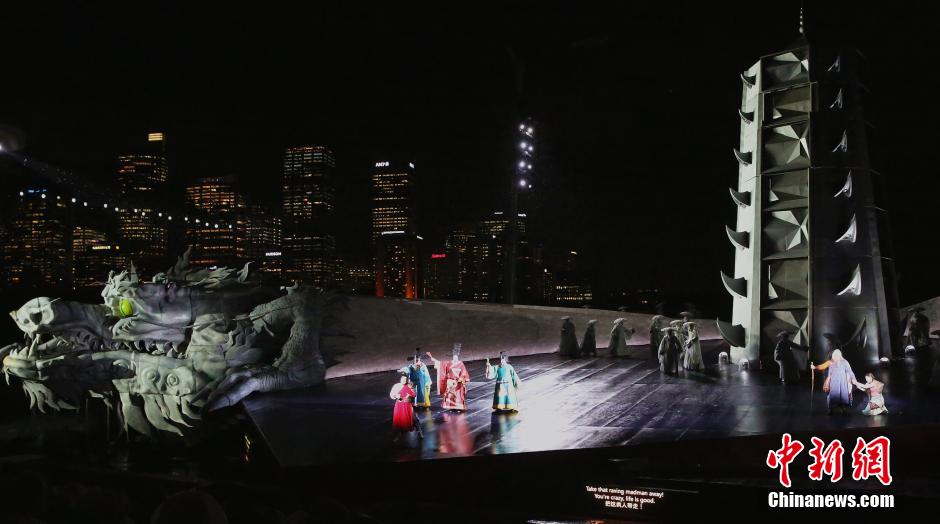 “这是一部最现代的,也最有东方色彩的《图兰朵》”陈士争对他的作品是这样评价的。《图兰多》在悉尼港湾的正式演出将从本月24日开始,并将持续演出一个月。图为舞台一侧是一条巨龙,它的身后则是悉尼的城市中心。 中新社记者 赖海隆 摄