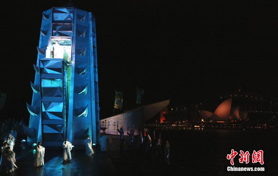 “这是一部最现代的,也最有东方色彩的《图兰朵》”陈士争对他的作品是这样评价的。《图兰多》在悉尼港湾的正式演出将从本月24日开始,并将持续演出一个月。图为露天舞台上的古塔与其身后现代西式的悉尼歌剧院相映成趣。 中新社记者 赖海隆 摄