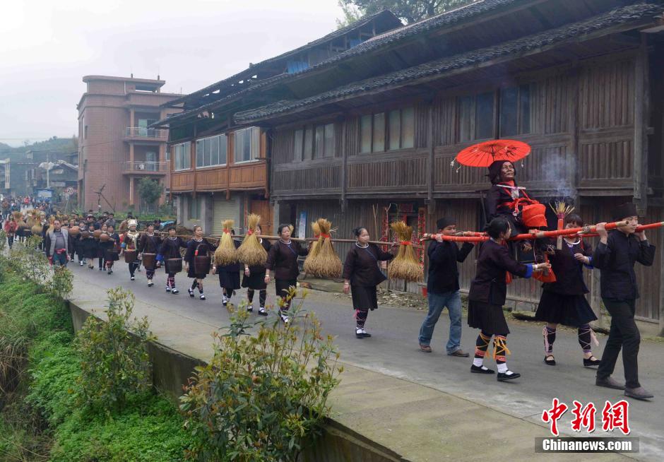 3月23日,农历二月十五日,广西桂林市龙胜各族自治县乐江乡宝赠村举办一年一度的“祭萨节”,近万名游客与当地民众在萨坛前举行“多耶”、对歌、吹芦笙等活动,以侗家独特的方式祭祀侗族始祖母“萨岁”。图为“萨岁”巡寨送吉祥。中新社记者 吴生斌 摄