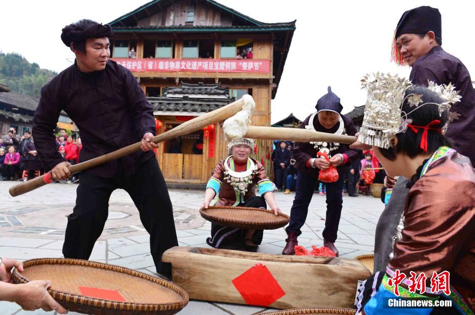 3月23日,农历二月十五日,广西桂林市龙胜各族自治县乐江乡宝赠村举办一年一度的“祭萨节”,近万名游客与当地民众在萨坛前举行“多耶”、对歌、吹芦笙等活动,以侗家独特的方式祭祀侗族始祖母“萨岁”。图为侗族同胞在表演打糍粑。中新社记者 吴生斌 摄