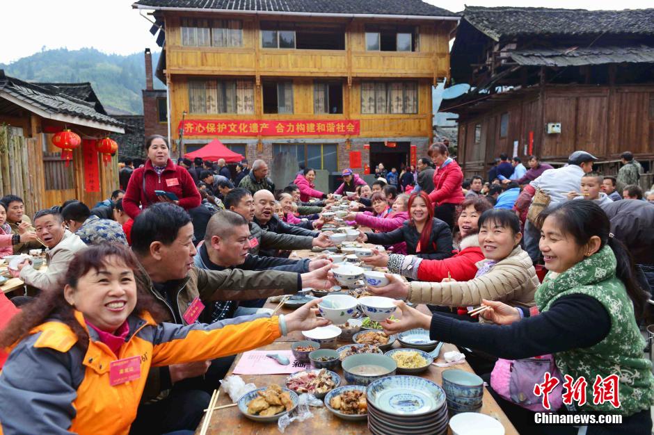 3月23日,农历二月十五日,广西桂林市龙胜各族自治县乐江乡宝赠村举办一年一度的“祭萨节”,近万名游客与当地民众在萨坛前举行“多耶”、对歌、吹芦笙等活动,以侗家独特的方式祭祀侗族始祖母“萨岁”。图为游客与侗族同胞同吃合拢宴。中新社记者 吴生斌 摄