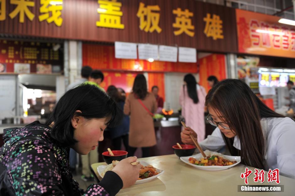 3月23日,云南大学滇池学院杨林校区食堂内,一家以盖饭为主的店铺别出心裁推出“水果肉片盖饭”系列,包括西瓜炒肉、苹果炒肉、橙子炒肉等,吸引学生追捧尝鲜。图为学生品尝其“水果炒肉盖饭”。中新社记者 任东 摄