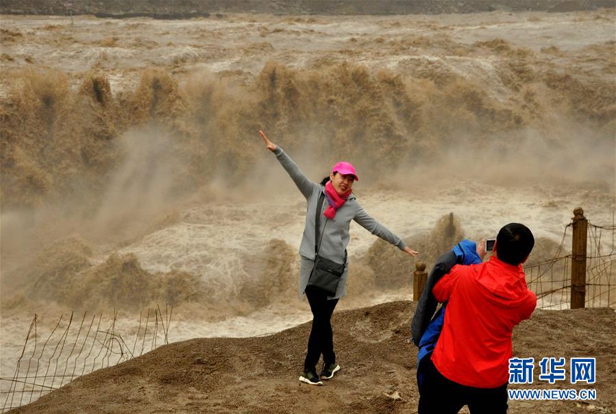 3月24日,游客在山西吉县黄河壶口瀑布拍照留念。
