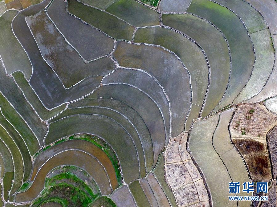 3月23日航拍的广西百色市右江区汪甸瑶族乡两琶村春耕田园图景。春分节气前后,桂西瑶乡风和日丽,当地农民抢抓晴朗天气投入水稻春耕春种生产。新耕种的田块弯弯曲曲,在春阳的映照下犹如大地韵律一般,美不胜收。新华社发(韦万忠 摄)