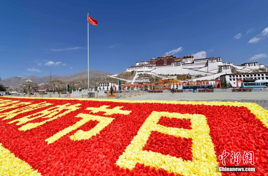 3月27日,西藏拉萨布达拉宫广场摆放巨型标语,迎接西藏百万农奴解放57周年纪念日。 中新社记者 李林 摄