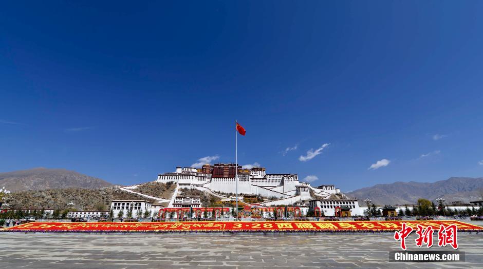 3月27日,西藏拉萨布达拉宫广场摆放巨型标语,迎接西藏百万农奴解放57周年纪念日。 中新社记者 李林 摄