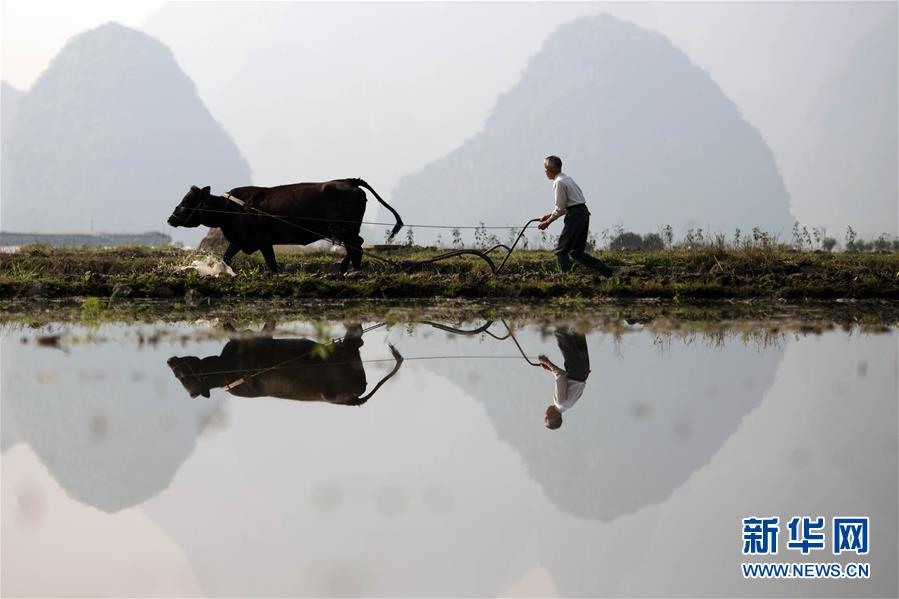 3月26日,广西桂林市临桂区会仙镇林湾村农民在犁田。随着天气转暖,桂北各地陆续进入春耕农忙时节。 新华社发(李忠波 摄)
