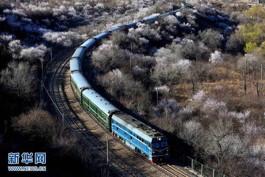 3月25日,列车在山花间穿行。近日,北京居庸关附近山花烂漫,列车在芬芳中穿行,春意盎然。 新华社发(王希宝 摄)