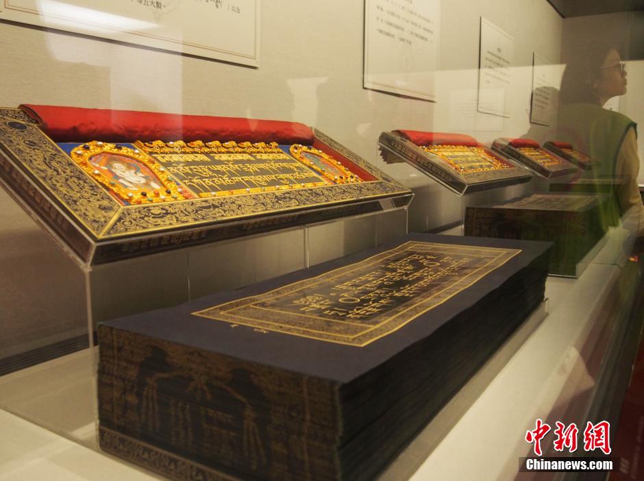 5月2日,“唵嘛呢叭咪吽—院藏藏传佛教文物”特展在台北故宫博物院开幕。该展览以藏文《龙藏经》为主要展件,搭配其他典籍、书画、法器、金铜佛等120组藏品,让观众有机会一览藏传佛教文物的特色。展出的藏文《龙藏经》,是现存历代中央政府写造时间最早、卷帙最庞大、装帧最富丽之藏传佛教法宝。1667年9月,康熙皇帝奉孝庄太皇太后之命,调集170余位僧人用泥金开始抄写,至1669年3月抄毕,总计花费白银40余万两。中新社记者 郑巧 摄