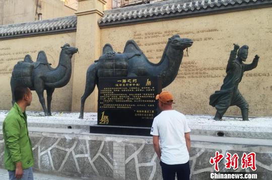 图为兰州盐场堡街道上的“一路有约”丝路运盐驼队雕塑。 杨艳敏 摄