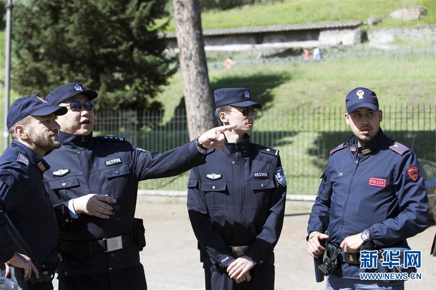 5月2日,在意大利罗马斗兽场外,中方警员庞波(左二)与意方警员沟通工作细节。