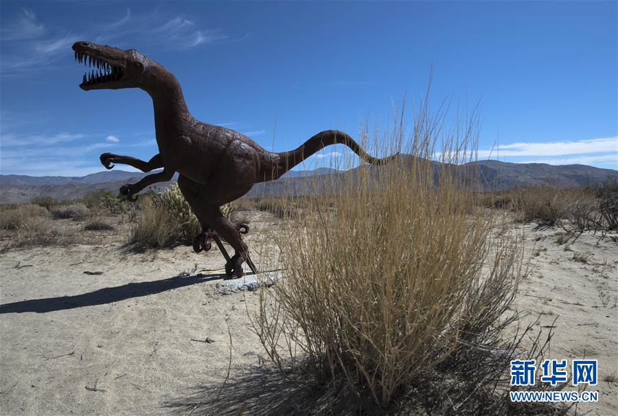 4月29日在美国南加州博雷戈山谷拍摄的一头在荒漠中跳跃的“恐龙”。行驶在南加州博雷戈山谷的荒漠中,一只只凶猛的“钢铁猛兽”会不时出现在公路两边,令人恍若置身于史前动物世界中。已故慈善家艾利丹尼斯从2008年起在这片荒漠上打造“天空艺术”,共由130多个铁制动物雕塑组成,其中包括一条长达106米的气势磅礴的中国龙。新华社记者杨磊摄