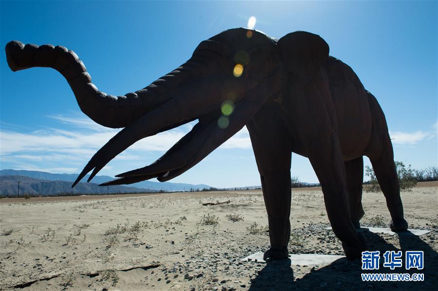 4月29日在美国南加州博雷戈山谷拍摄的一头“大象”。行驶在南加州博雷戈山谷的荒漠中,一只只凶猛的“钢铁猛兽”会不时出现在公路两边,令人恍若置身于史前动物世界中。已故慈善家艾利丹尼斯从2008年起在这片荒漠上打造“天空艺术”,共由130多个铁制动物雕塑组成,其中包括一条长达106米的气势磅礴的中国龙。新华社记者杨磊摄