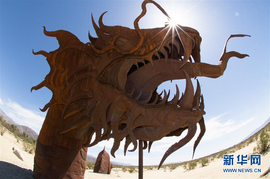 4月29日在美国南加州博雷戈山谷拍摄的一条“巨龙”。行驶在南加州博雷戈山谷的荒漠中,一只只凶猛的“钢铁猛兽”会不时出现在公路两边,令人恍若置身于史前动物世界中。已故慈善家艾利丹尼斯从2008年起在这片荒漠上打造“天空艺术”,共由130多个铁制动物雕塑组成,其中包括一条长达106米的气势磅礴的中国龙。新华社记者杨磊摄