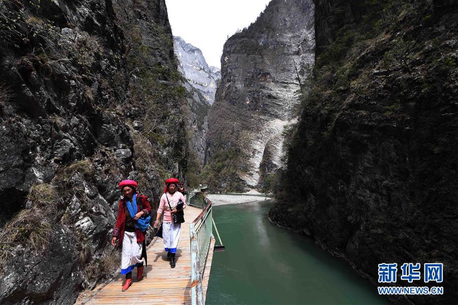 5月2日,两名藏族妇女行走在香格里拉大峡谷栈道上。新华社记者杨宗友摄
