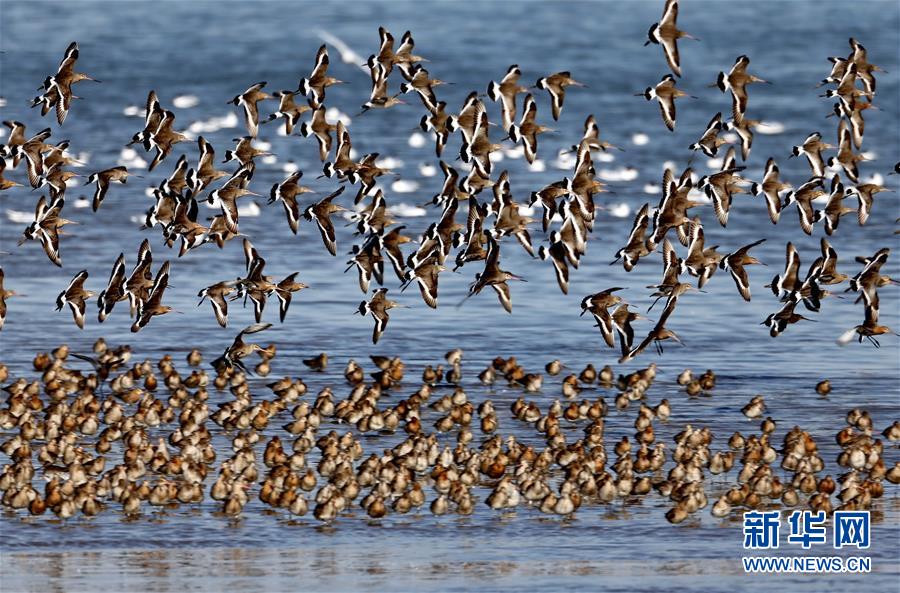5月3日,一群候鸟在秦皇岛市山海关石河沿海湿地飞舞。近日,大批北迁候鸟飞临地处候鸟南北迁徙通道上的河北省秦皇岛沿海湿地,吸引了中国、比利时、荷兰、英国等国家和地区的诸多观鸟团队前来观鸟。每年约有400多种、上千万只候鸟南北迁徙经过秦皇岛,还有种类、数量可观的夏候鸟和留鸟在本地繁衍生息,鸟类资源丰富,每年5月和10月初都会有大批观鸟人来秦皇岛观鸟。新华社记者杨世尧摄