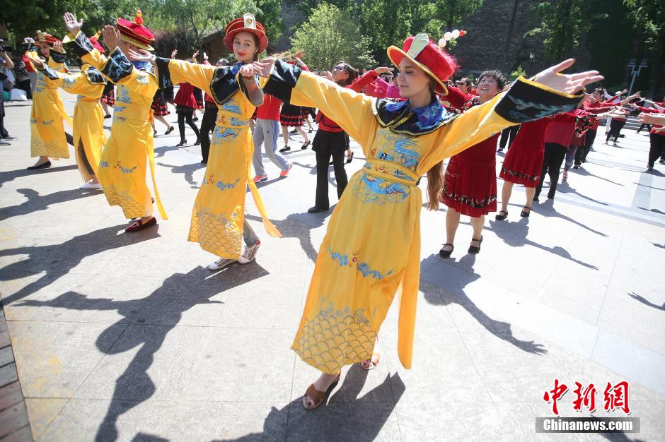 5月3日,“乾隆”带着四个同样穿着龙袍的洋妃子现身南京玄武湖畔,与百位大妈跳起广场舞,格外引人注目。 中新社记者 泱波 摄
