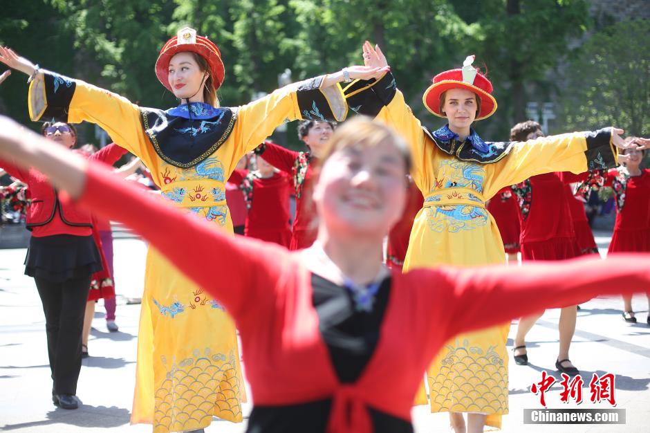 5月3日,“乾隆”带着四个同样穿着龙袍的洋妃子现身南京玄武湖畔,与百位大妈跳起广场舞,格外引人注目。 中新社记者 泱波 摄
