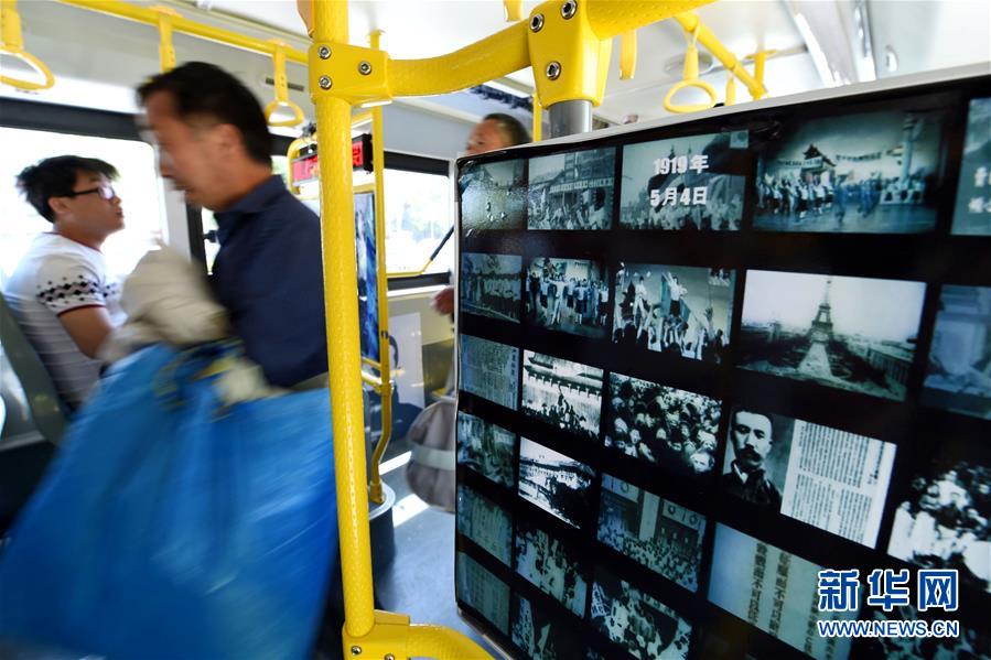 5月3日,市民乘坐“五四”文化主题公交车。近日,河南郑州一辆62路公交车的车长云悉自己动手,用“五四”文化主题的老照片、绘画、标语等装饰车厢。云悉说,“五四”青年节是属于年轻人的节日,希望通过这样的形式,让年轻人了解历史,传承“五四”精神。新华社记者 李博 摄