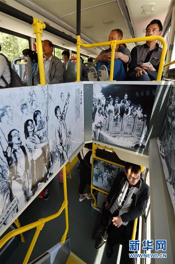 5月3日,市民乘坐“五四”文化主题公交车。近日,河南郑州一辆62路公交车的车长云悉自己动手,用“五四”文化主题的老照片、绘画、标语等装饰车厢。云悉说,“五四”青年节是属于年轻人的节日,希望通过这样的形式,让年轻人了解历史,传承“五四”精神。新华社记者 李博 摄