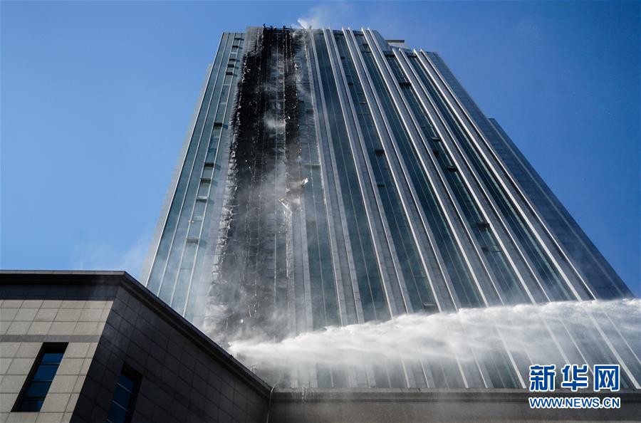 5月3日,消防员在进行灭火救援。当日15时许,江苏南京闹市区一座写字楼失火,现场明火沿6层外墙一路烧至楼顶。发现火情后,消防官兵迅速赶赴现场处置,至15时49分现场明火被扑灭,无人员伤亡报告。起火原因为大厦6楼平台的中央空调失火。新华社记者李响摄