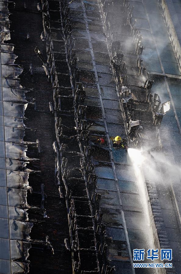 5月3日,消防员在进行灭火救援。当日15时许,江苏南京闹市区一座写字楼失火,现场明火沿6层外墙一路烧至楼顶。发现火情后,消防官兵迅速赶赴现场处置,至15时49分现场明火被扑灭,无人员伤亡报告。起火原因为大厦6楼平台的中央空调失火。新华社记者李响摄