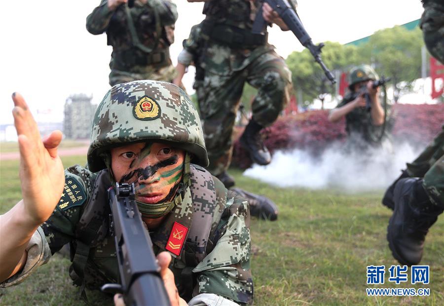5月3日,马双龙带领战士们演练单兵战术。马双龙是武警上海总队一支队士官,入伍以来先后荣立三等功2次,多次被所在部队表彰为优秀共产党员、优秀士官。在班长的位置上,马双龙一干就是十余年,他率先垂范,言传身教,带过的战士快速成长。他说:“既然选择了部队,就一定做个优秀的兵。” 新华社记者 陈飞 摄