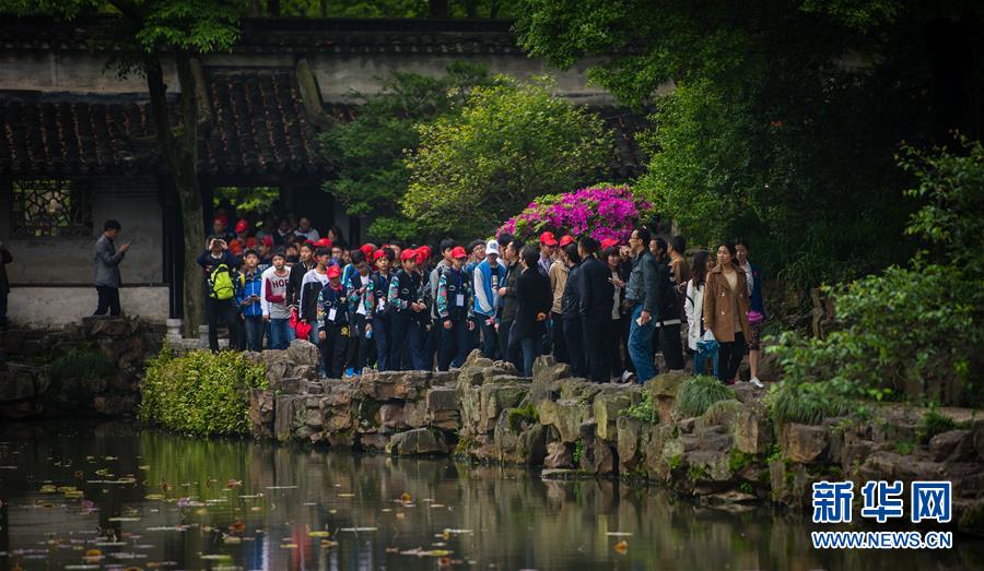 游客在苏州拙政园内游玩(4月27日摄)。作为国内外著名的旅游文化名城,苏州市近年来建立健全工作机制,提升市民文明素养和社会文明程度,努力促使文明成为城市最美的风景。新华社记者李响摄