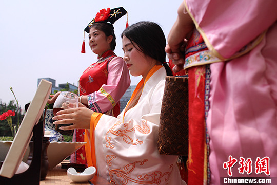 5月3日,女子身穿明清宫廷服饰为茶商站台。当日,参加第五届中国·四川国际茶叶博览会的各大茶商陆续入驻。