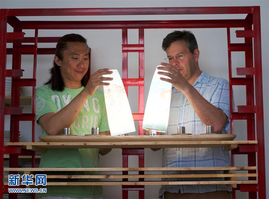 5月3日,“八月”(左)和“盖”在工作室内检查刚做好的陶瓷灯。