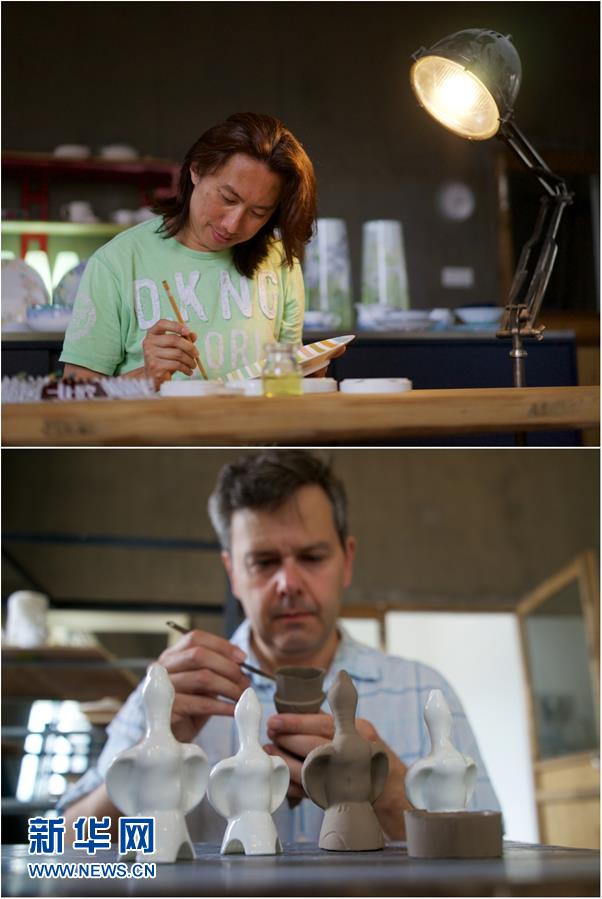 上图:“八月”在工作室绘制陶瓷;下图:“盖”在工作室对一件作品进行“修坯”处理(拼版照片,5月3日摄)。新华社记者胡晨欢摄