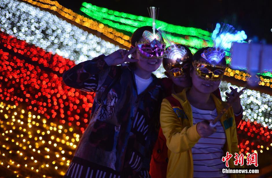 5月3日晚,民众在灯光背景前拍照。近日,梦幻灯光节在呼和浩特一公园开幕,据主办方介绍,灯光节共用约2000万根发光灯管。中新社记者 刘文华 摄