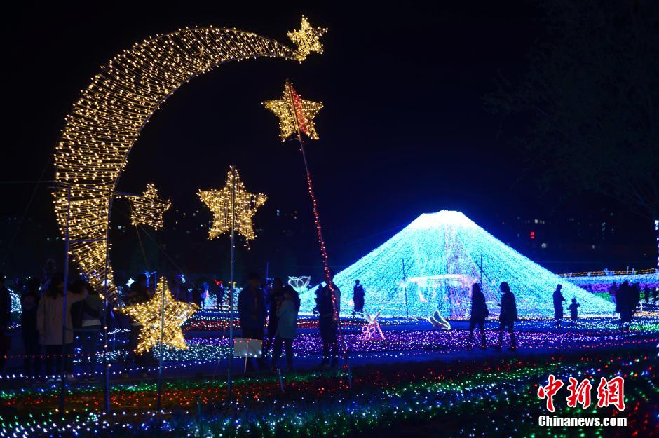 5月3日晚,民众游走在光影中。近日,梦幻灯光节在呼和浩特一公园开幕,据主办方介绍,灯光节共用约2000万根发光灯管。中新社记者 刘文华 摄