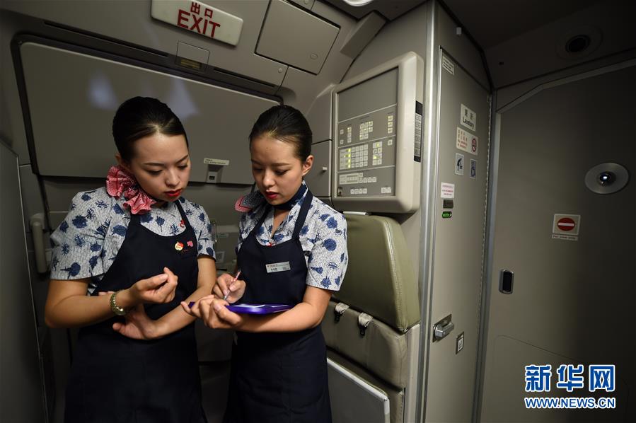 在北京至兰州的航班上,邢海静(右)和邢海平(左)核对广播词(5月3日摄)。新华社记者 范培珅 摄