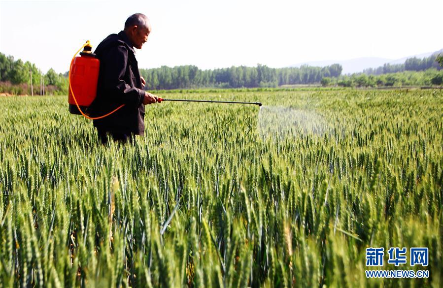5月4日,山东省枣庄市山亭区山城街道善崮村农民在对小麦进行“一喷三防”管理。立夏节气将至,农业生产进入管护的重要时节,各地农民抢抓时机开展生产,田间地头一派忙碌的景象。 新华社发(张强 摄)