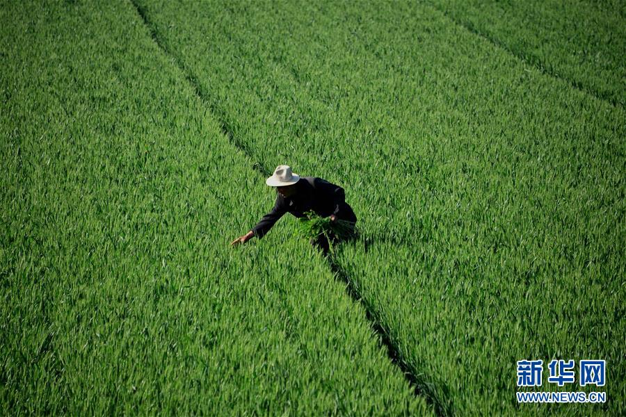 5月4日,山东省聊城市茌平县贾寨镇耿大庄村的农民在麦田里清除杂草。立夏节气将至,农业生产进入管护的重要时节,各地农民抢抓时机开展生产,田间地头一派忙碌的景象。 新华社发(赵玉国 摄)