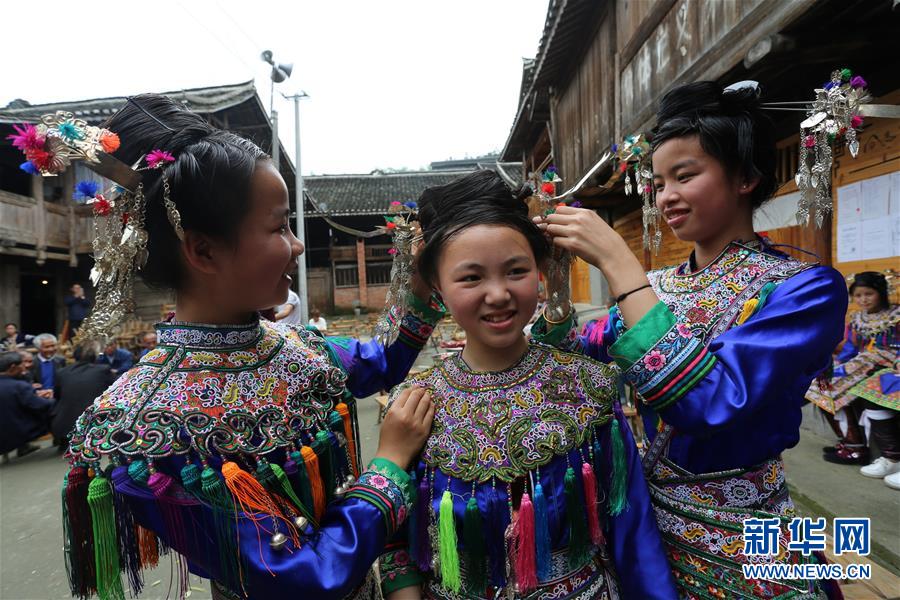 5月3日,贵州省榕江县乌公侗寨的姑娘相互整理盛装,准备参加竹米节活动。当天,贵州省首批魅力侗寨——榕江县乌公侗寨欢度传统的竹米节,重温侗民远古农耕风情。竹米节也叫吃竹笋饭,在每年谷雨至立夏期间竹笋生长的时候,侗族群众采摘斑竹笋,把糯米灌进笋筒煮熟食用。这样既能保持米饭的原味,又有竹笋的清香,并且还方便携带至坡上田间地头食用。久而久之,侗族人每到春夏之交的农耕时节都会过竹米节,杀猪宰羊祭祀侗族祖先,唱歌跳舞祈求五谷丰登。新华社发(杨成利 摄)